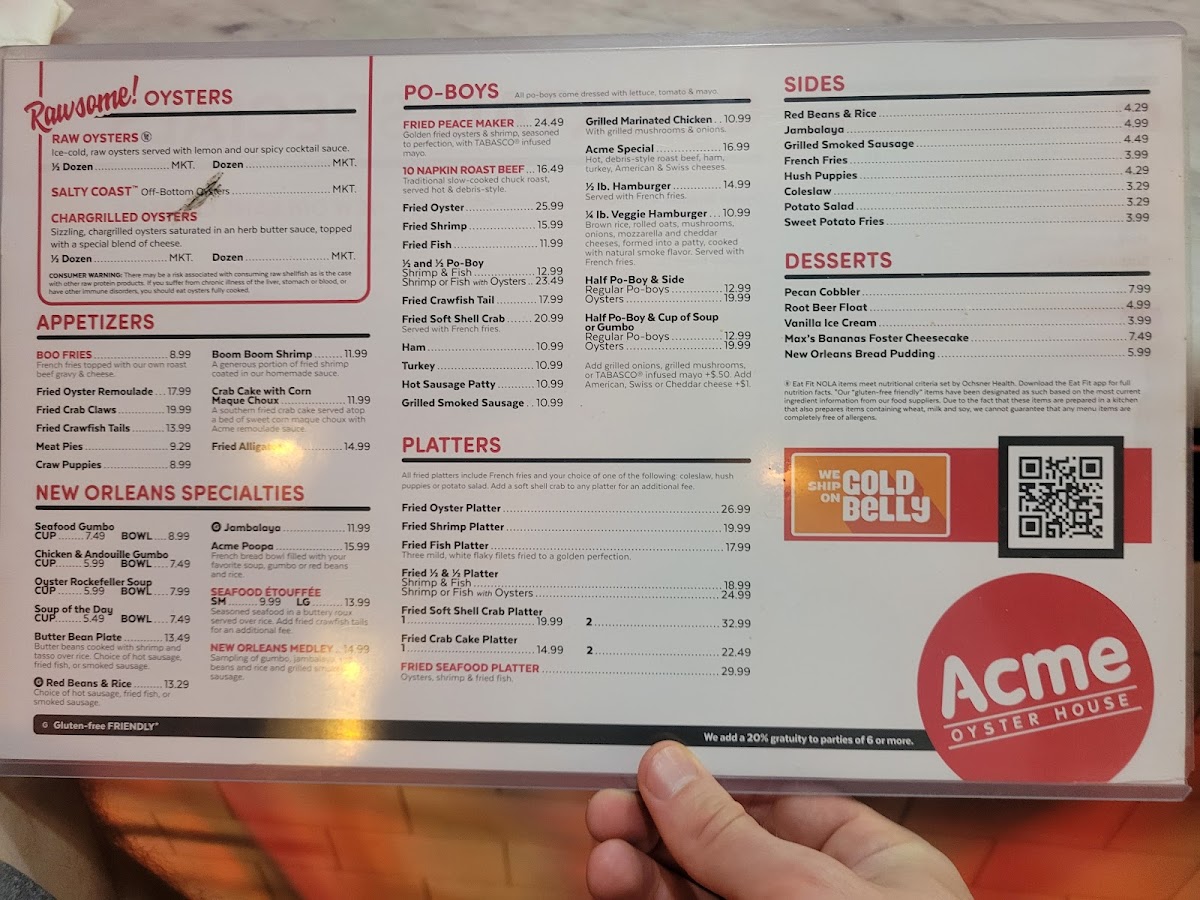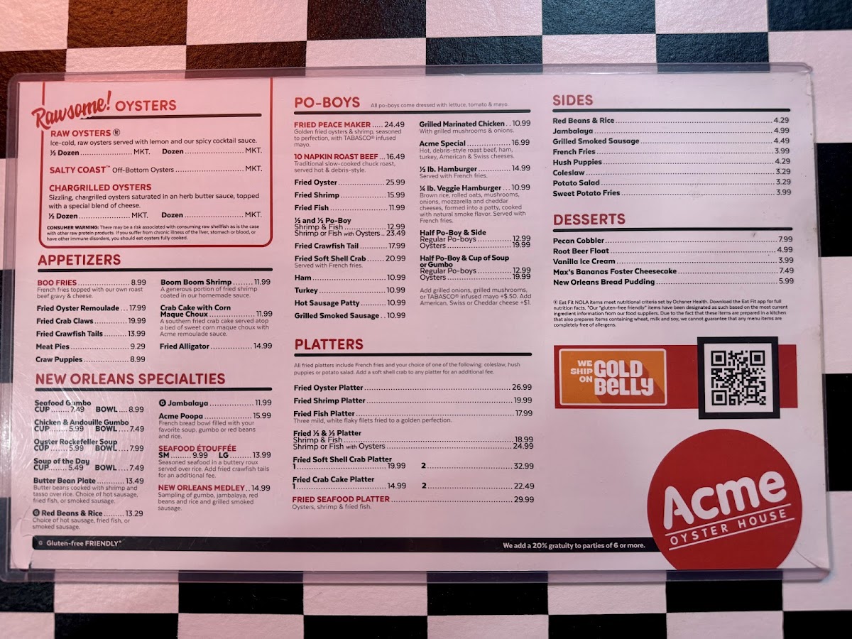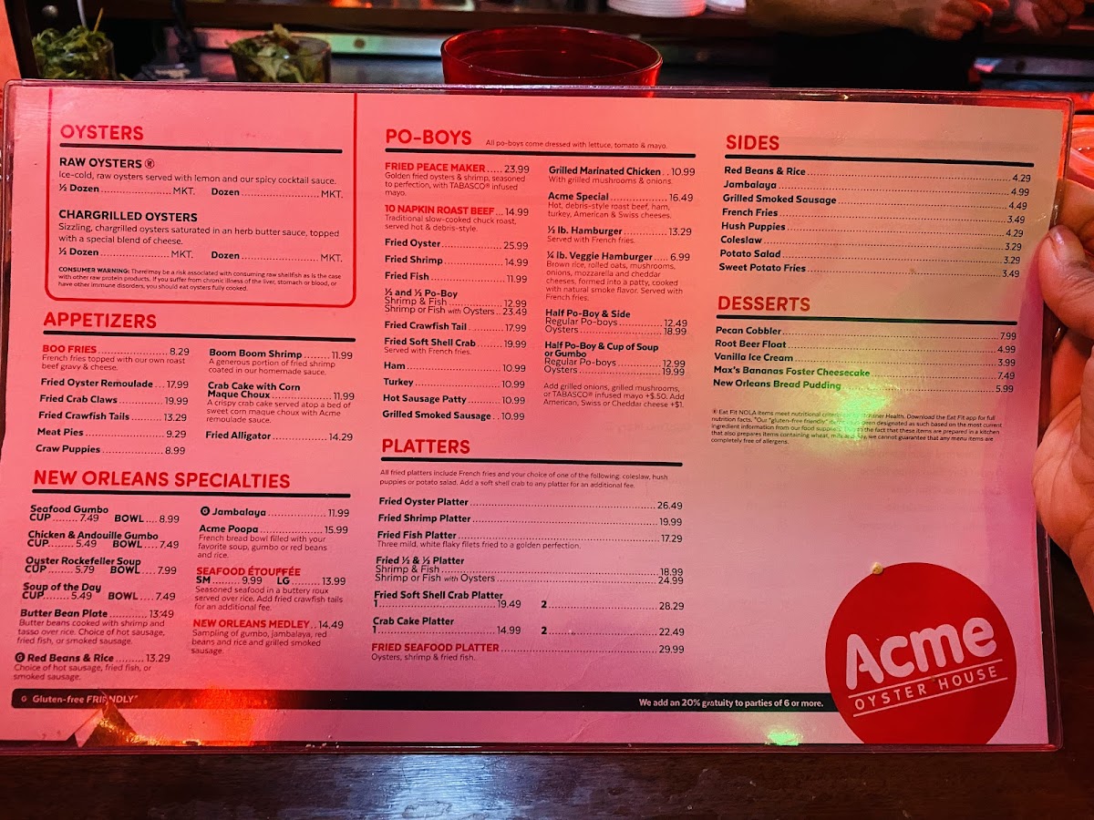 We went 3 times on our 6 day trip this is a must try the char grill oysters are the bomb I've never been a fan of oysters but my guys love them but Acme does it right I'm now a fan! A Big Fan! We have 2 different poboys the peace maker and roast beef and ham ect both good boom shrimp was amazing we tried red beans & rice, gumbo, jambalaya .. for dessert pecan pie and bread pudding blue moon beer everything here was 5stars we got t-shirts just a great fun place all the food was perfect right off bourbon st